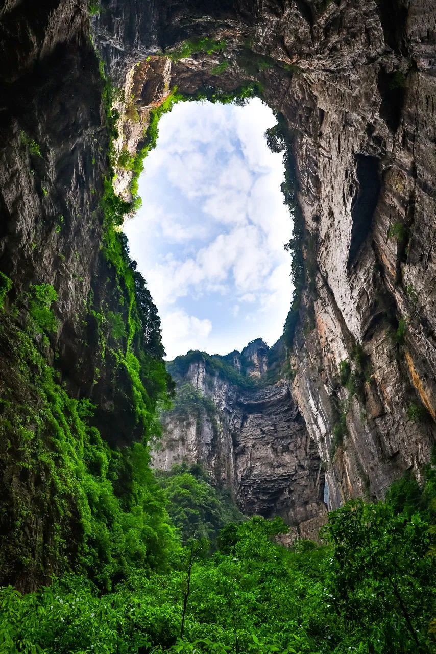 坑底景色慢慢出现在眼前,仿佛走入一片世外桃花源。