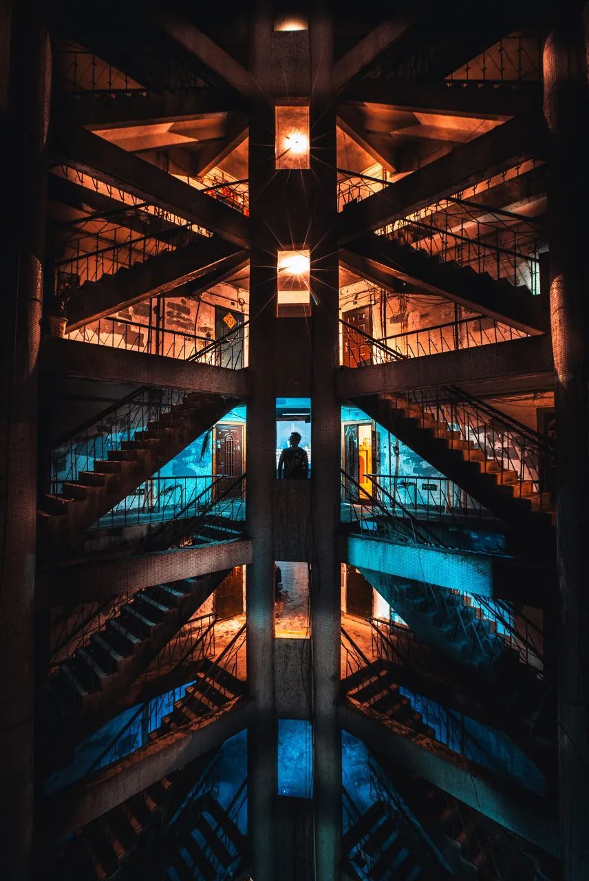 修建于七八十年代的老房子,两旁上下楼梯,中间一个天井,四周光线很暗,唯有中间一抹光,因此呈现出魔幻般的效果。