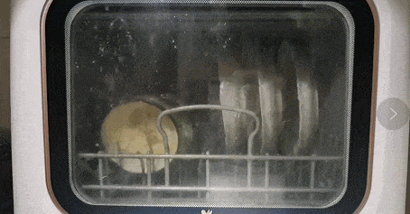 为什么没有洗干净呢?其实原因很简单,因为台上式的洗碗机体积小,只有一个主喷淋臂和顶部一个小喷淋臂,所以在喷淋臂工作的过程中难免出现死角,当污渍过于顽固时,部分水柱因为死角的问题就无法喷淋到污渍上,导致盘子没有完全被洗干净,但可以看到盘子的大部分都是洗干净的,这也证明了,即便是最低端的洗碗机它的喷淋臂喷射的水柱工作是有效果的。