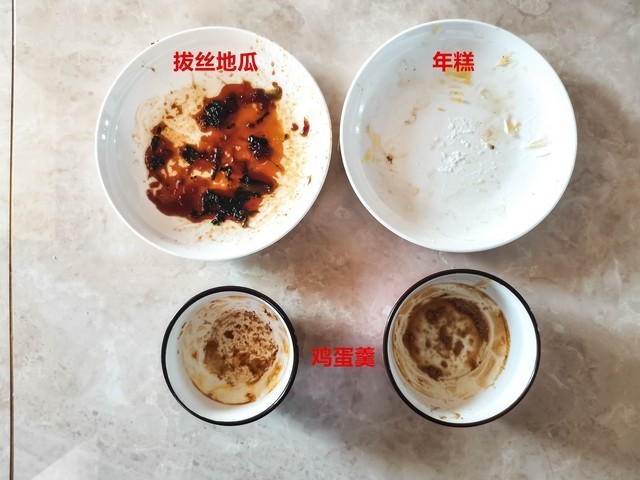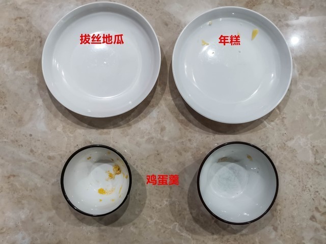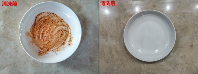 通过图片可以看到,参与测试的鸡蛋羹、拔丝地瓜、年糕的三个盘子中,只有拔丝地瓜被清洗的非常干净。而鸡蛋羹中大碗的鸡蛋羹清洗后鸡蛋羹残留较少,小碗的鸡蛋羹清洗后残留较多。年糕的盘子中大部分年糕残留物都被清洗干净了,只有少部分年糕还残留在盘子上。