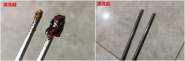 另外参与对比测试的模拟正常炒菜后的盘子和沾满硬糖浆的筷子,都清洗的非常干净。