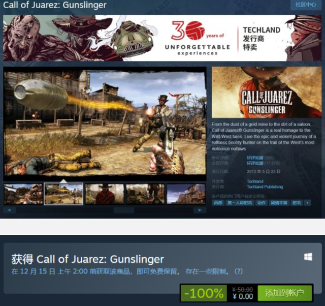 Steam喜加一活动!本次送出的是原价50元的经典游戏《狂野西部:枪手》,一经领取即可入库,活动将于12月15日结束。