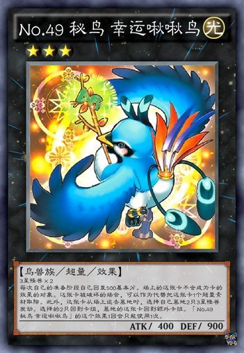 3星怪兽×2;每次自己的准备阶段自己回复500基本分。场上的这张卡不会成为卡的效果的对象。这张卡被破坏的场合,可以作为代替把这张卡1个XYZ素材取除。此外,这张卡从场上送去墓地时,选择自己墓地2只3星怪兽发动。选择的2只回到卡组,墓地的这张卡回到额外卡组。No.49 秘鸟幸运啾啾鸟的这个效果1回合只能使用1次。