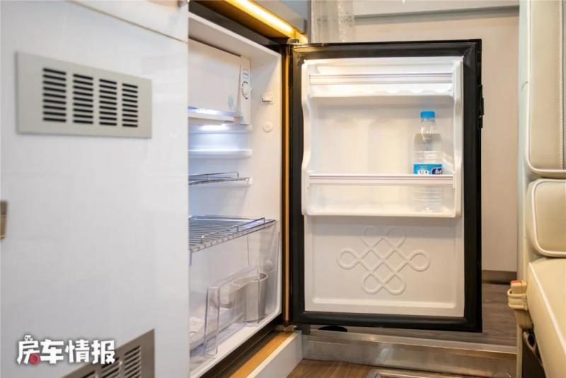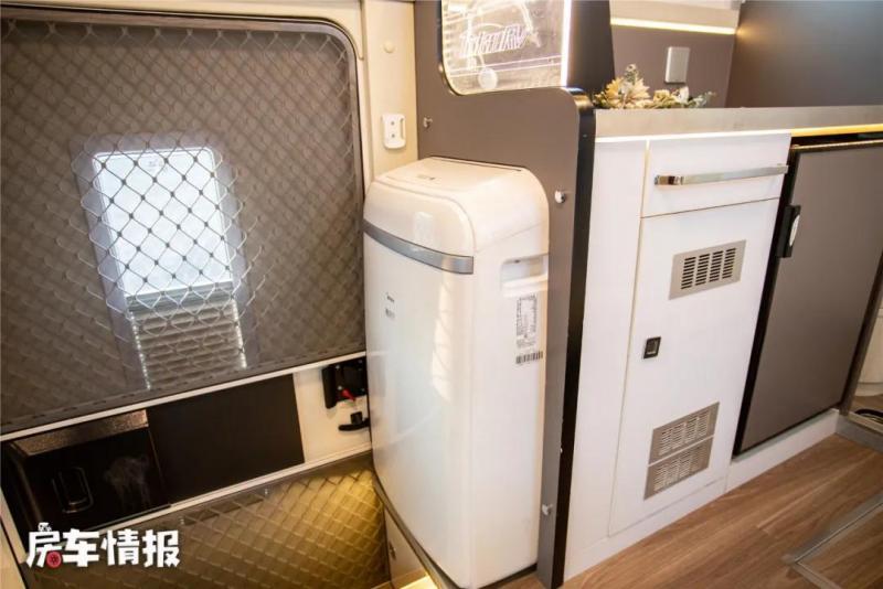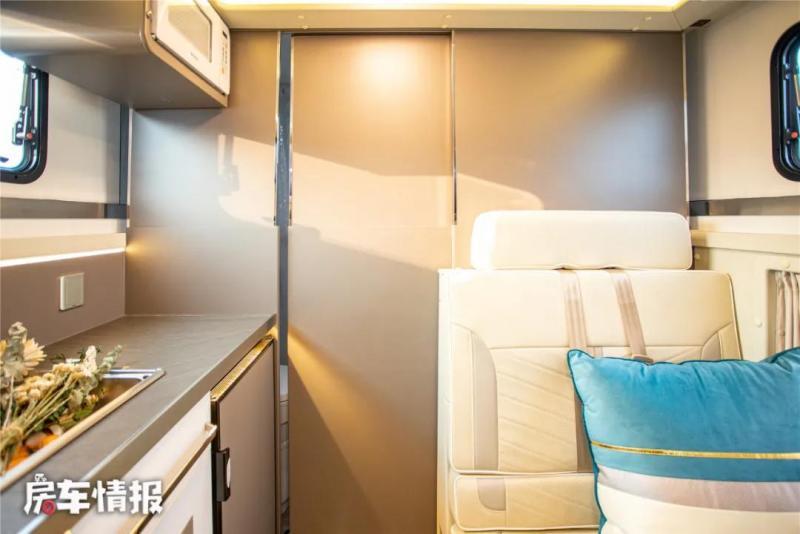 厨房区位于乘客门后方,台面上带有翻盖的洗手盆,下方则提供了一台嵌入式的88L房车专用冰箱,内部也带有单独的冷冻区域,满足日常分类存放食材的需求。另外顶部还悬挂了一台微波炉。