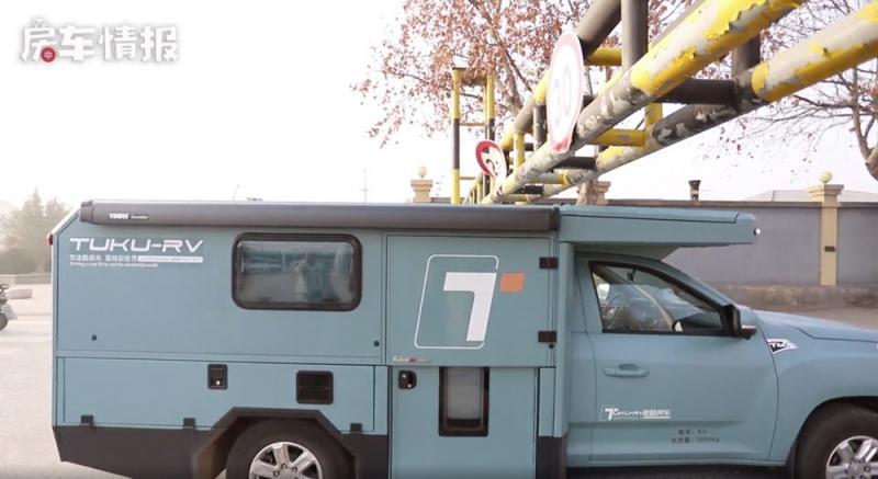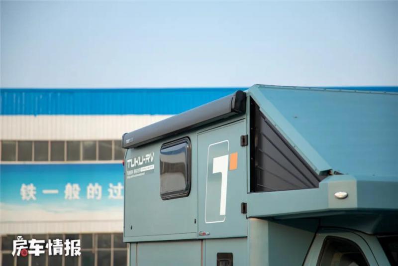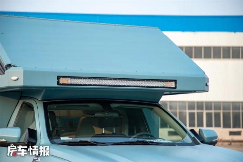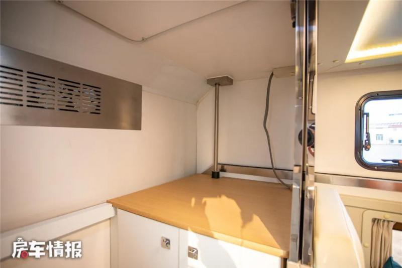 将升顶升起的过程中,可以发现,并不是采用主流的液压杆软式升顶,而是采用了螺旋杆硬质升顶结构,顶部完全升起之后,全车的高度可以达到2.6米,则可以保证车内正常的站立以及活动,最关键的是无论是驻车还是行车状态时,整车都可以保持升顶的状态,而当有遇到限高时,为了保证安全通过,则可以降下升顶,变成高度仅2米的状态,使其顺利通过限高。