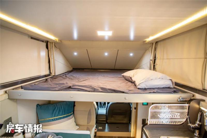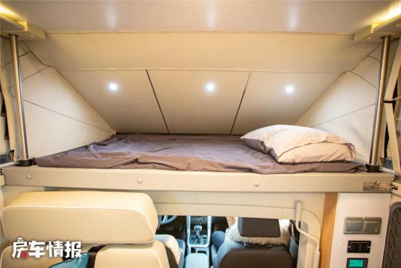 而车内唯一的固定式床铺是位于驾驶室上方的区域,且带有可抽拉拓展的功能,拓展后尺寸达到了2000*1880mm,完全满足日常的睡眠休息需求。
