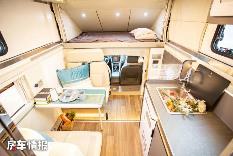 进入车厢内部,内部的设计也丝毫不逊色,整体的装修风格非常轻奢精致,采光度和通透性也很不错,这全部得益于硬质升顶上的窗户,使整车内部的采光范围增加了不少,而且升起升顶后,内部所呈现的空间就和主流房车相差无几了,高度达到了1.87米,完全不用担心站不直的问题。而降下的时候,极限高度也可以满足1.75米身高的人正常坐着。