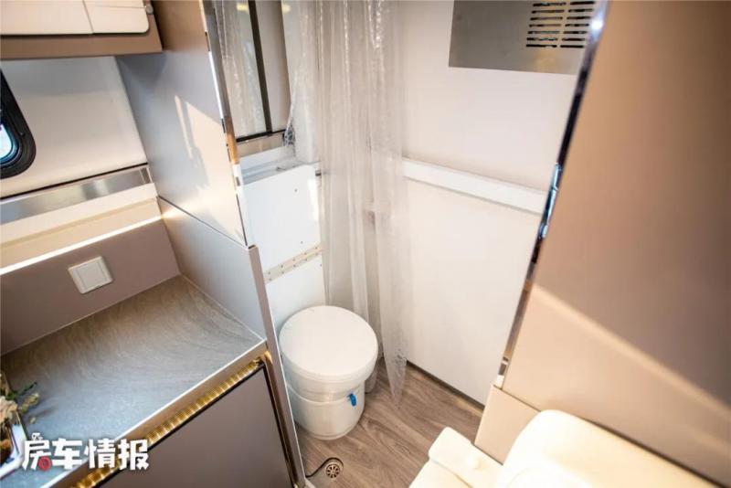 车厢尾部,是一间封闭式的卫生间,内部空间还是非常可观的,配置了马桶、隐藏式洗手盆、抽拉式花洒、梳妆镜等,满足日常的洗漱需求。