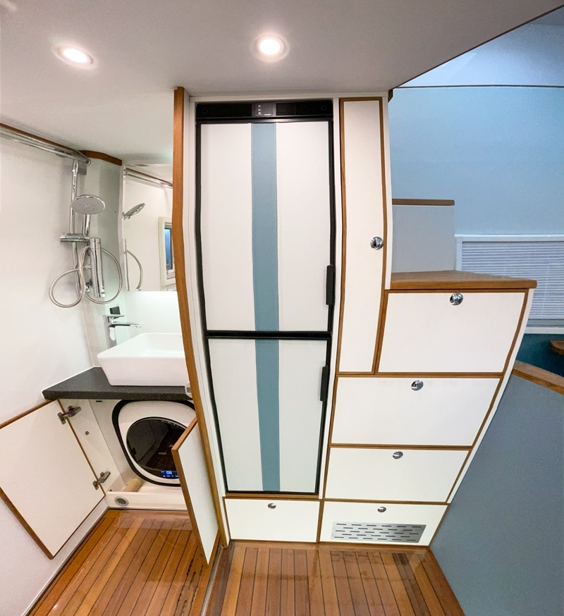 电动脚踏入门更便捷,密码锁提升安全系数,身体工程学设计空间更大更舒适,3.68米高度不压抑更愉悦。贴心配备会客区照明LED灯带,点亮车内空间,享受美好时光。厨房区域碗柜、操作台、水池等一体式组合,动静功能划分明确,使用过程更加顺手。卫浴间空间区分合理,干湿分离设计还能带来私密空间。独立的衣帽间满足爱美需求,衣物存放更加干净整洁。