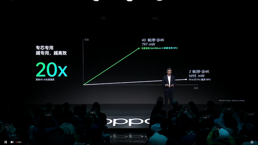 在DSA架构于高精度的台积电6nm工艺加持下,与通用芯片比较的情况下,OPPO马里亚纳 X芯片可以实现更好的AI性能和能效比,高达18Tops的AI算力甚至是超过了苹果A15芯片。OPPO马里亚纳 X芯片在运行OPPO AI降噪模型的速度是达到Find X3 Pro(骁龙888)的20倍,能效达到40倍。