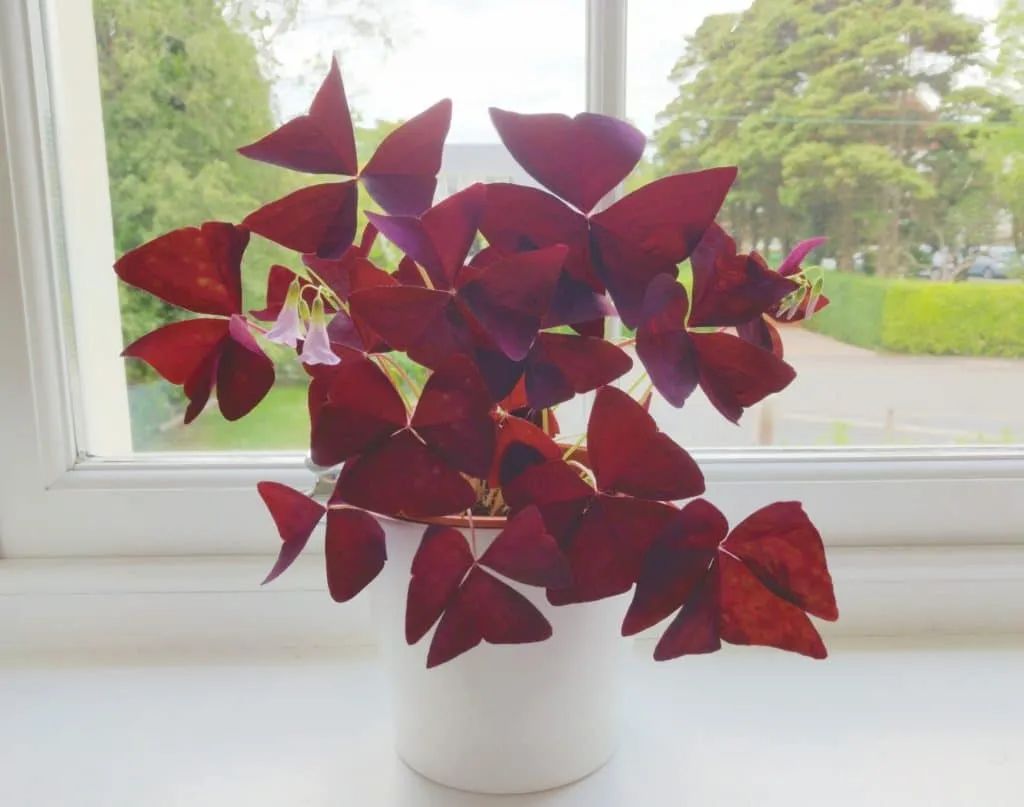 紫叶酢浆草是比较受欢迎的一种低光照室内观赏花卉,它也被称作紫色幸运草,能在植株顶端开出粉嫩的花朵。