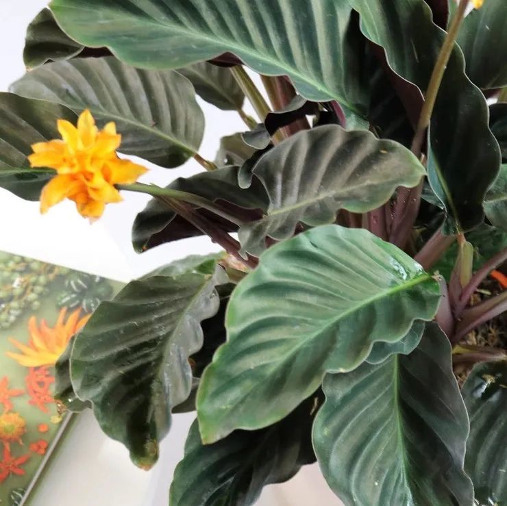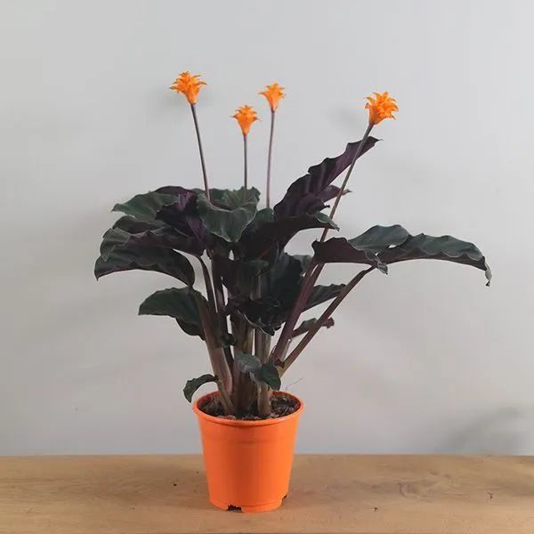 黄苞竹芋也经常被叫做金花竹芋,它能在植株顶端开出橙黄色的花朵,它的花远远看着就像一朵朵火焰一般,可以在翠绿的叶子顶端长出高高的花梗,是非常引人注目的一种观赏竹芋品种。