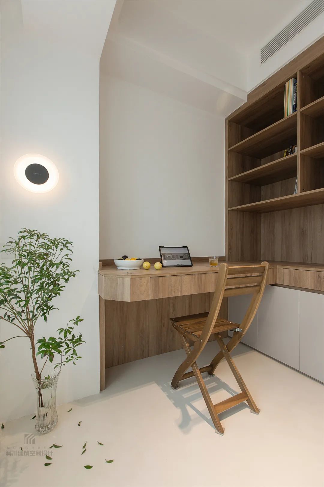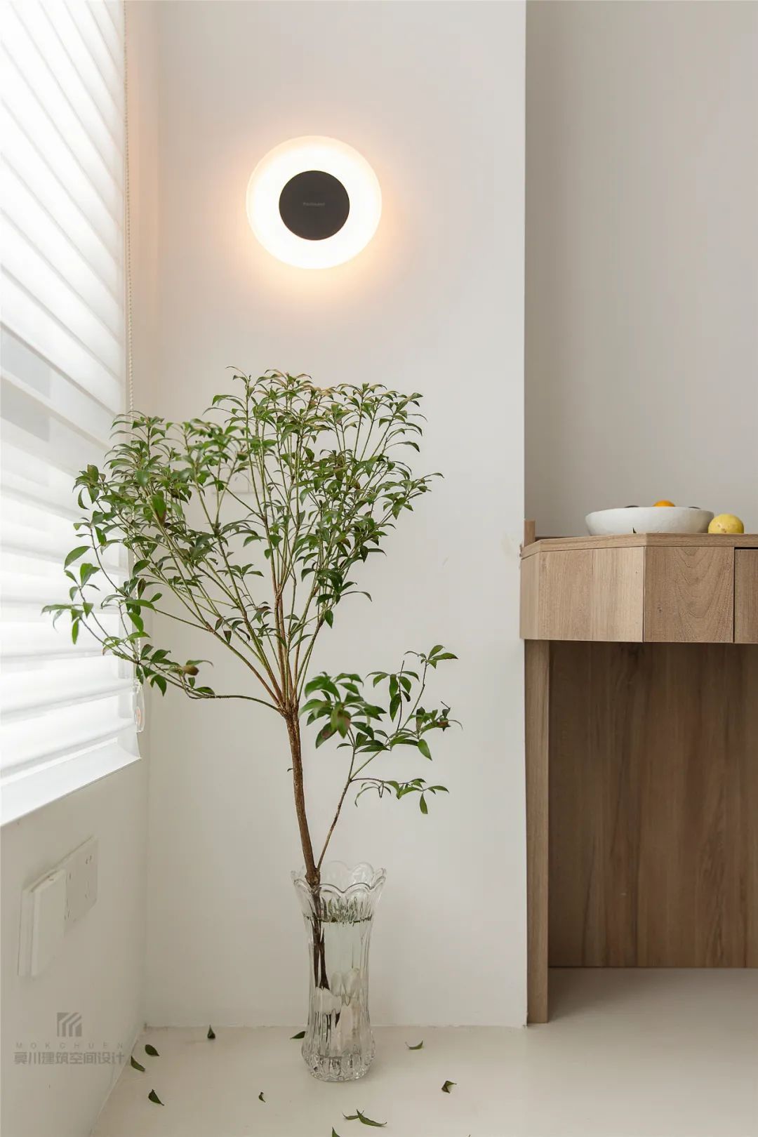 ▲窗户边的墙脚位置摆上一个玻璃花瓶,插上新鲜的马醉木枝叶,上方装一盏简雅的壁灯,也让书房空间有着一股清新文艺的气息。