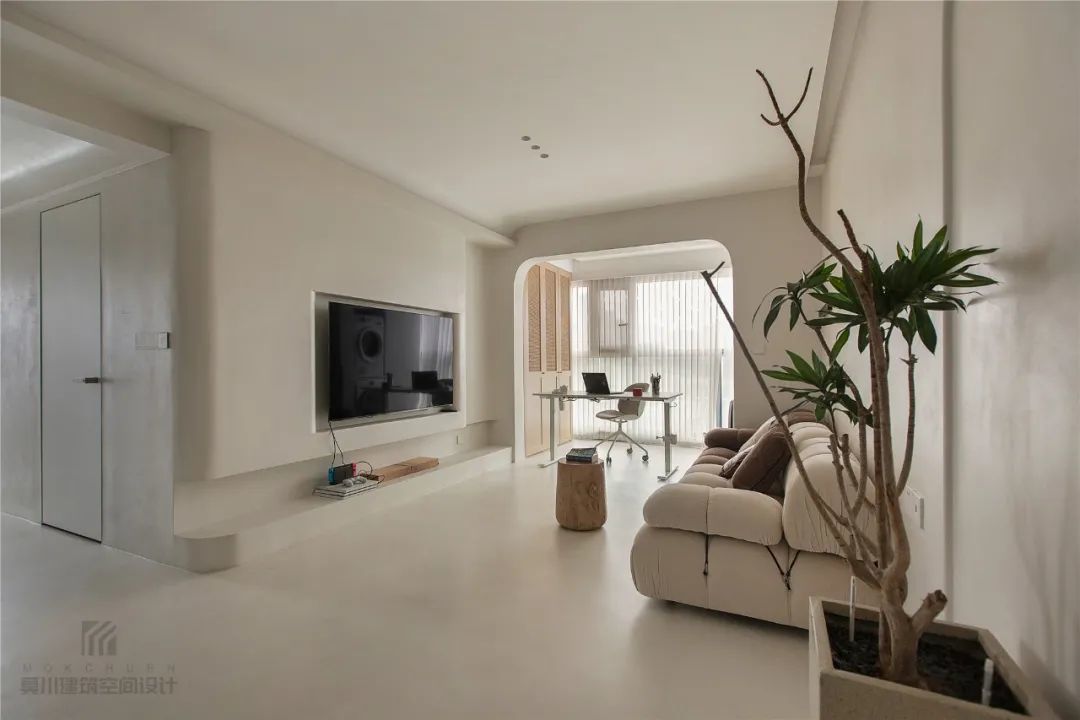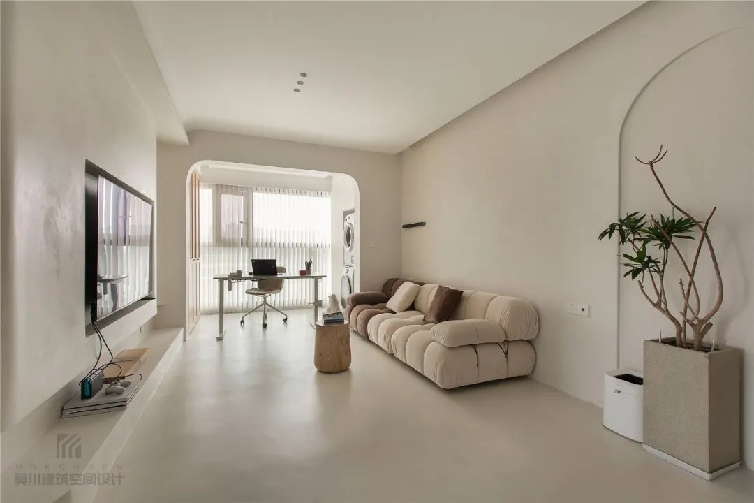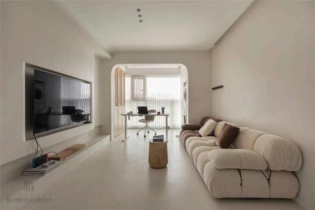 ▲客厅整体极简风的空间,采取淡淡的米咖色为空间主调,在门洞、阳角处加入圆滑的设计,带来一种简单而不失优雅气质的氛围感。
