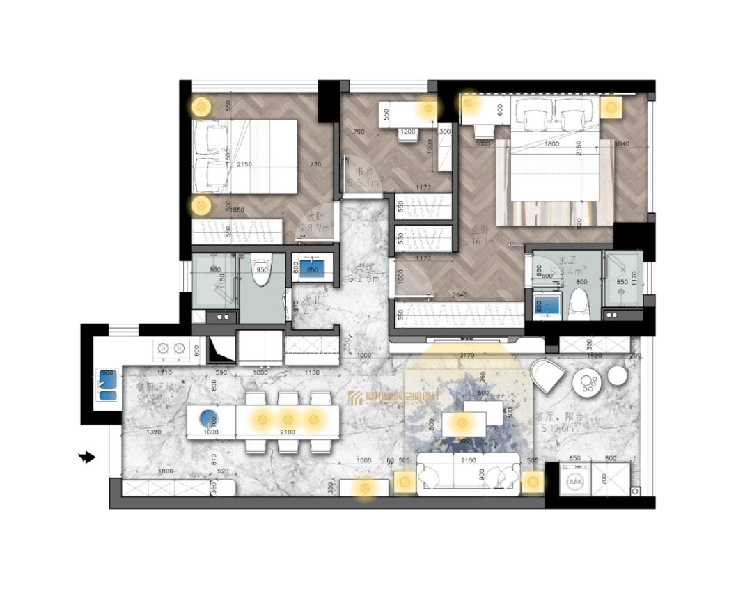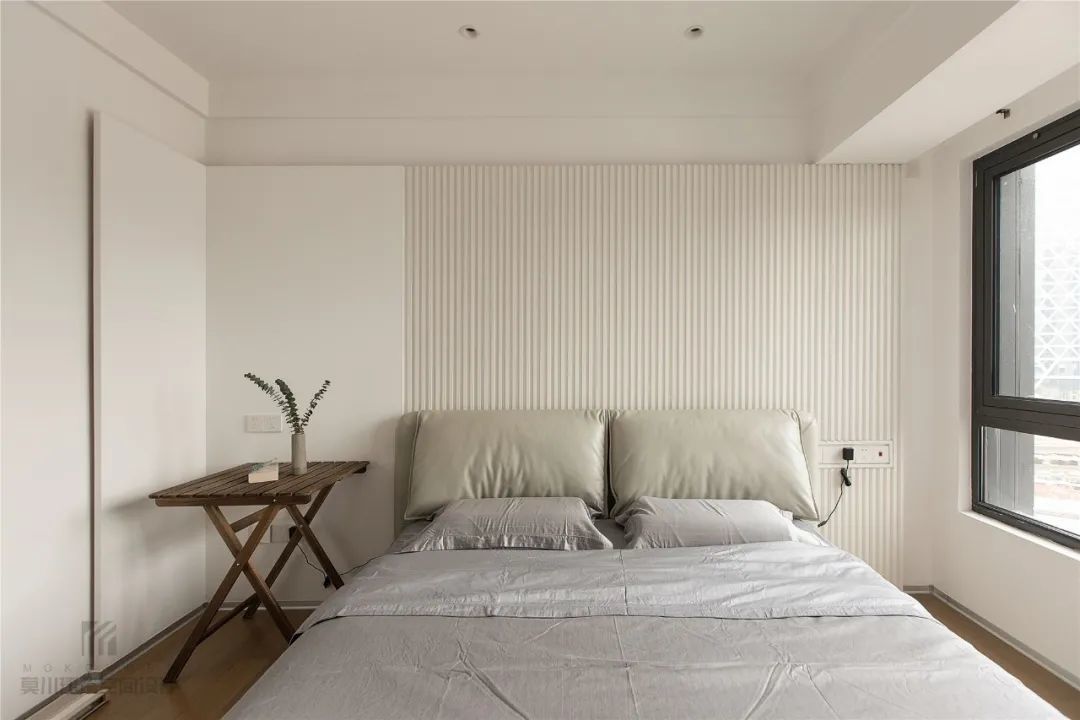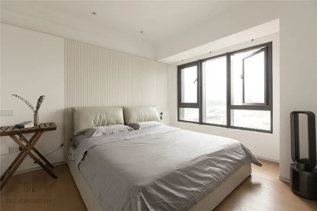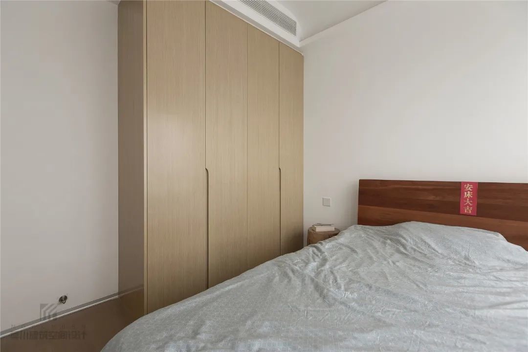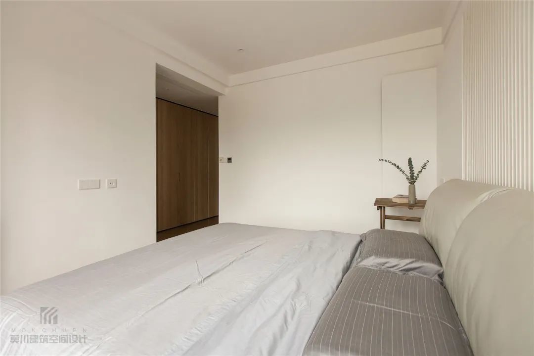 ▲整个卧室以无主灯的设计,结合简洁的墙面空间,布置简约朴素的床单,带来一种轻松舒适的惬意氛围,床尾后的过道就是衣帽间区域。
