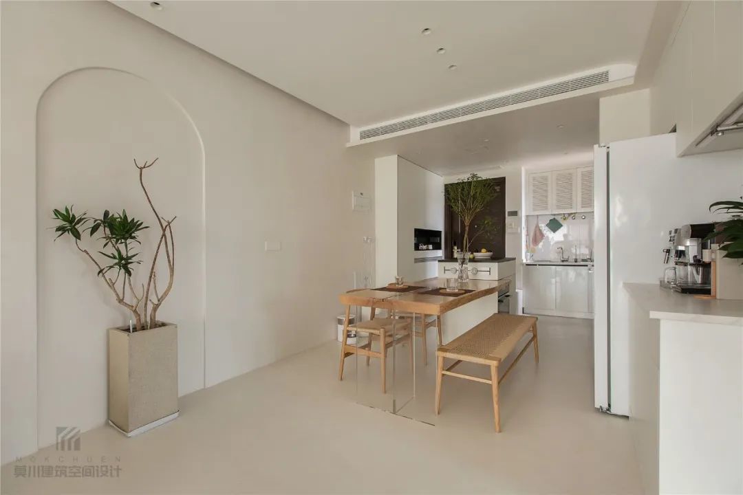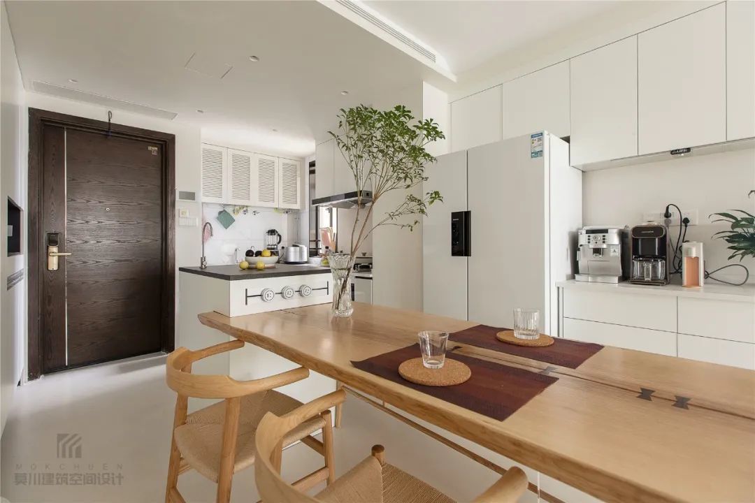 ▲餐厅在靠近大门区域,在正中间位置加入中岛台,并挨着中岛台摆上一张长餐桌,搭配上木质餐椅与板凳,整个空间显得朴素自然而大方。