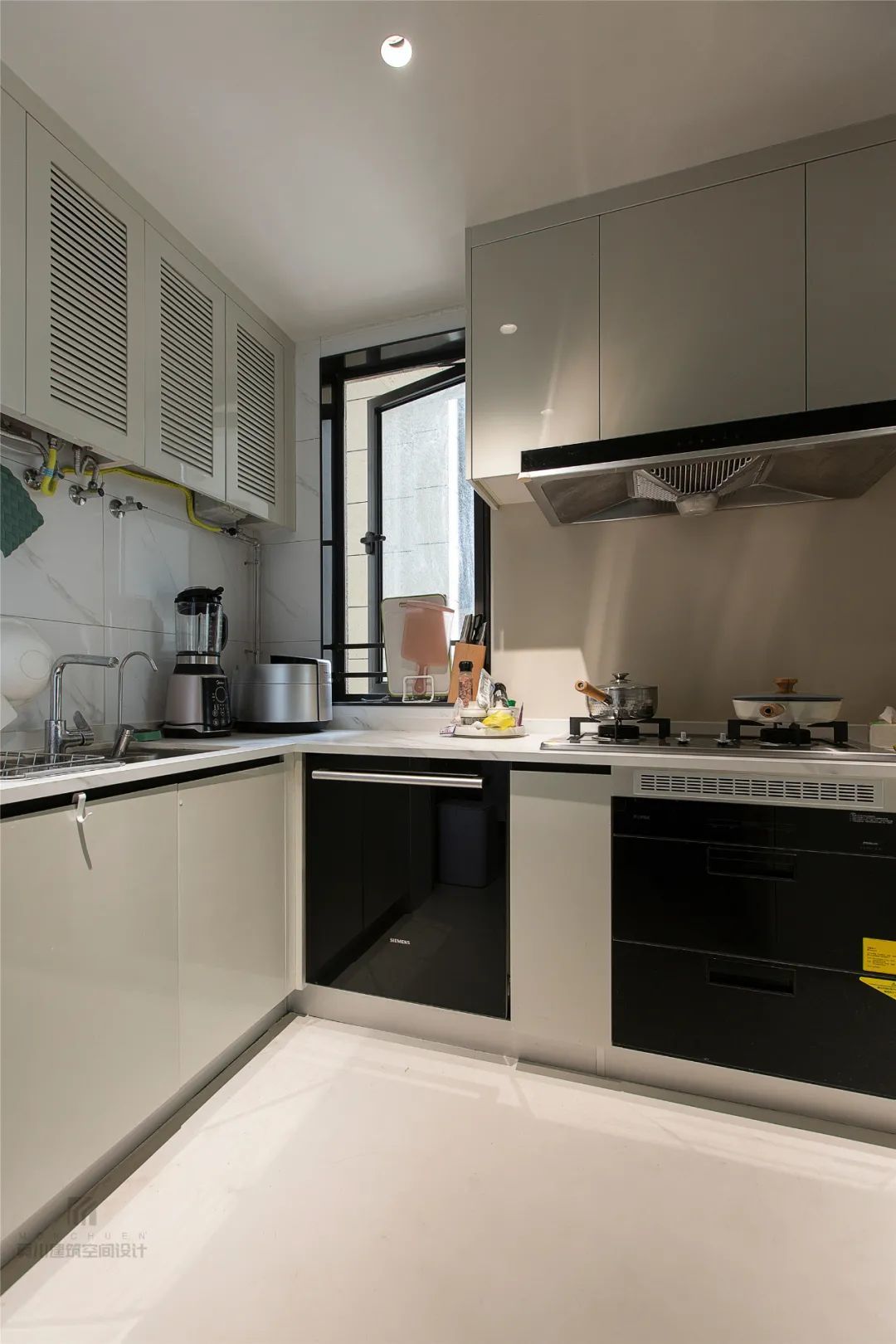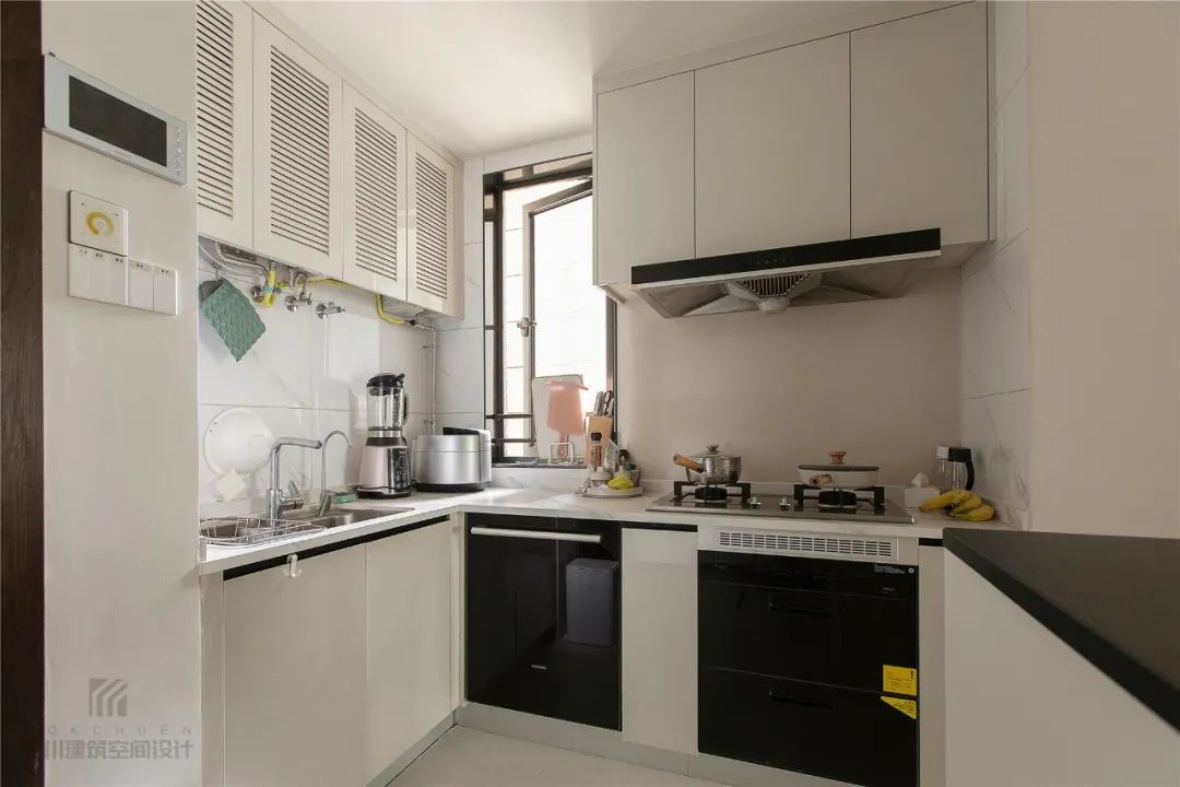 ▲小窗+开放式空间,让小厨房也明亮大方,上方吊柜藏了煤气表,因此采取百叶门的设计,让空间显得美观实用两不误。