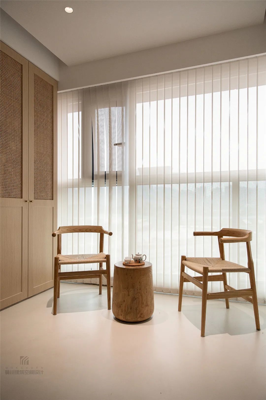 ▲窗户也大叶百叶帘的设计,布置上民宿风的休闲椅与木桩小茶几,在这里喝茶聊天也是一种别样舒适的惬意。