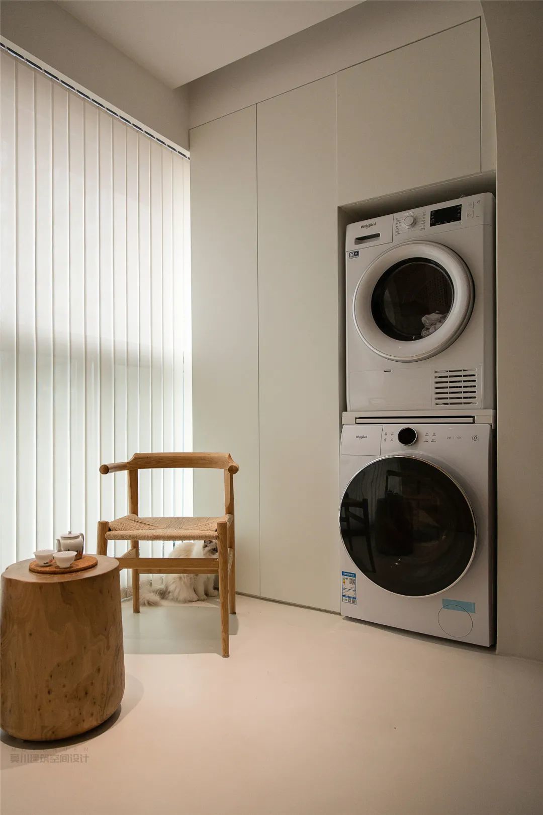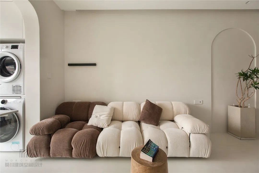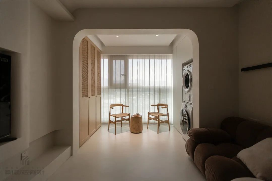 ▲阳台与客厅之间打通,门洞做成拱形圆弧的设计,让空间显得更加流畅有趣;阳台左侧装一排收纳柜,右侧是杂物柜+嵌入洗衣机、烘干机的组合,中间摆一套休闲小茶几与椅子,使得阳台具备了洗烘衣物的实用与喝茶聊天的休闲功能。