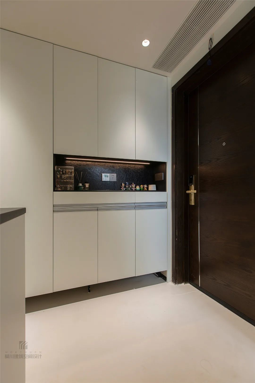 ▲玄关处加入定制的鞋柜,鞋柜中间留空摆上可爱的小公仔与香薰瓶,底部留空作为常换鞋子的收纳位置,简洁实用的鞋柜,使得整个空间设计都实用又合理。