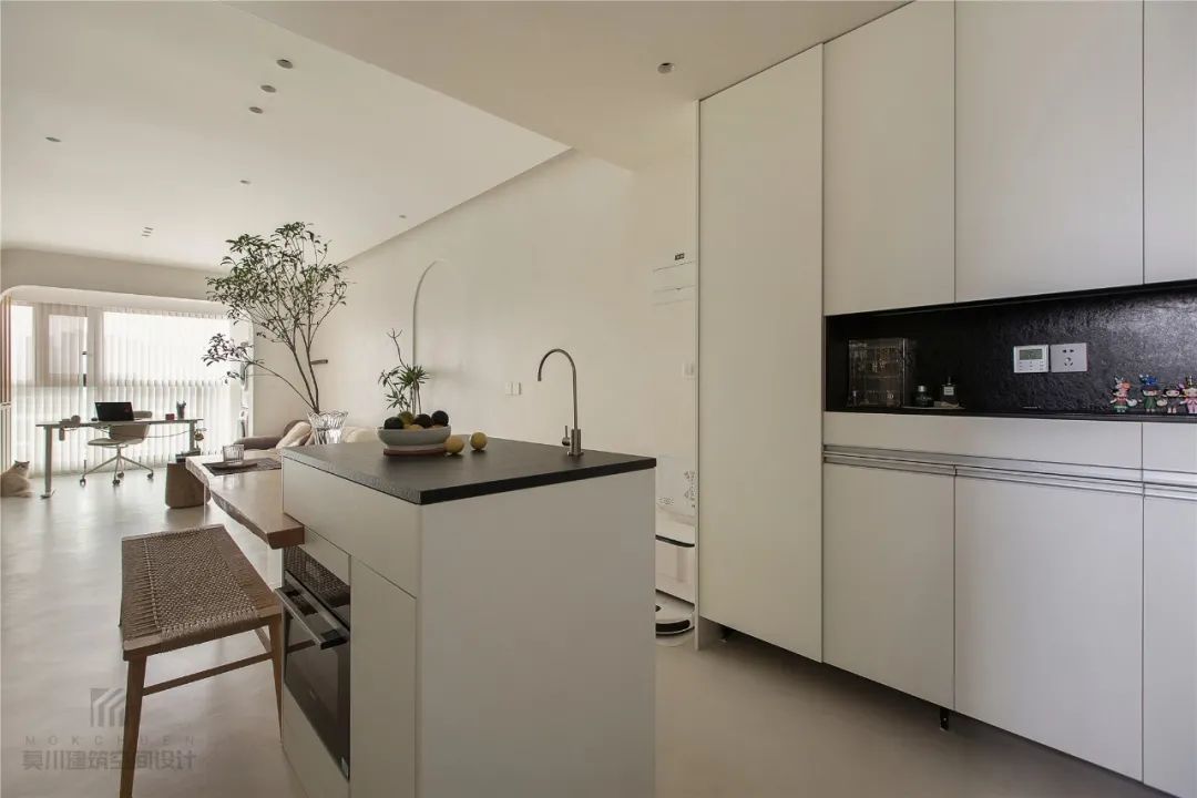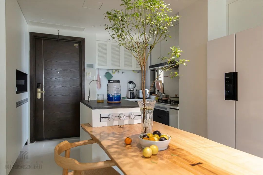 ▲餐桌挨着中岛台定制设计,黑白配的中岛台与鞋柜、厨房的风格一样,整体视觉比较时尚,为主人提供了一种现代舒适的生活仪式感。