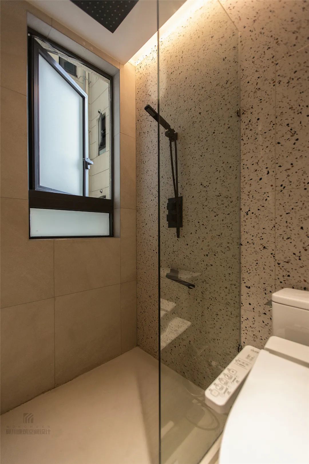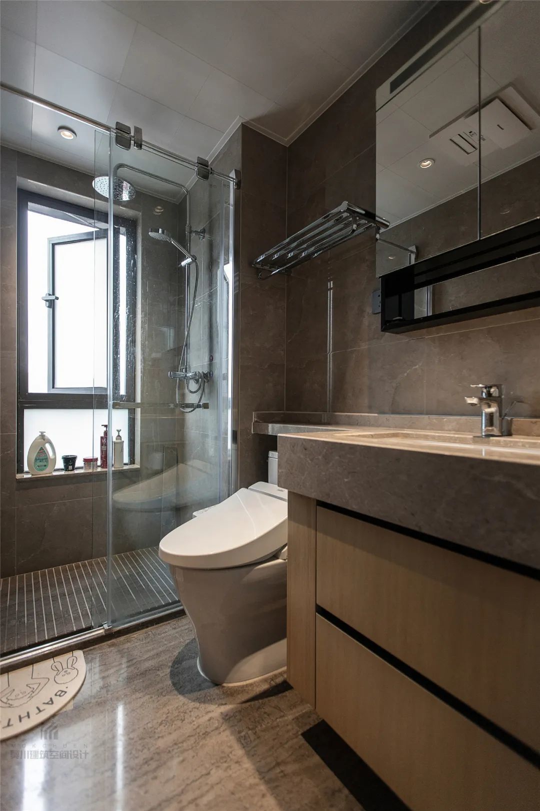▲灰色墙面地面,并加入了水磨石砖的设计,通过暗藏灯带的无主灯设计,营造出一种极简优雅的卫浴空间氛围感。