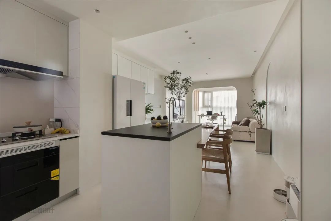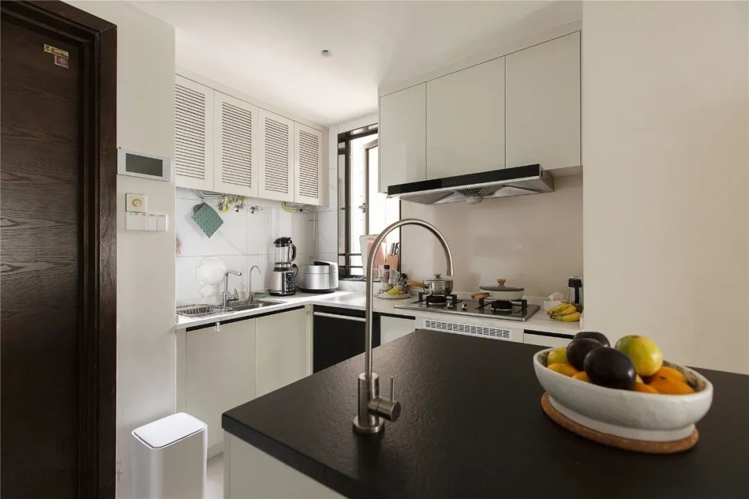 ▲厨房尽管面积不大,但以开放式的布局设计,并在客餐厅之间加入了一个中岛台,在L字形的操作台下,也带来了一个宽敞舒适的厨房烹饪空间