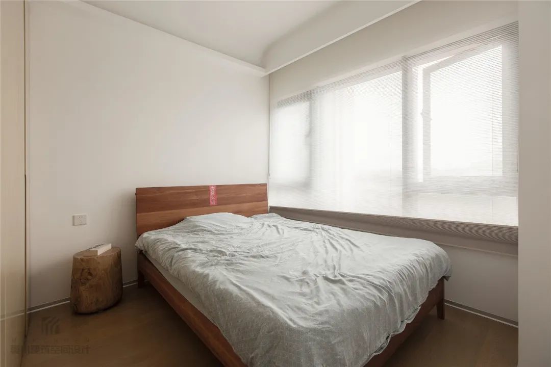 ▲次卧也是以极简风的空间为主,布置上实木床,铺上简约灰的床单,窗帘采取透光度较好的卷帘设计,整个空间显得简洁实用而舒适。