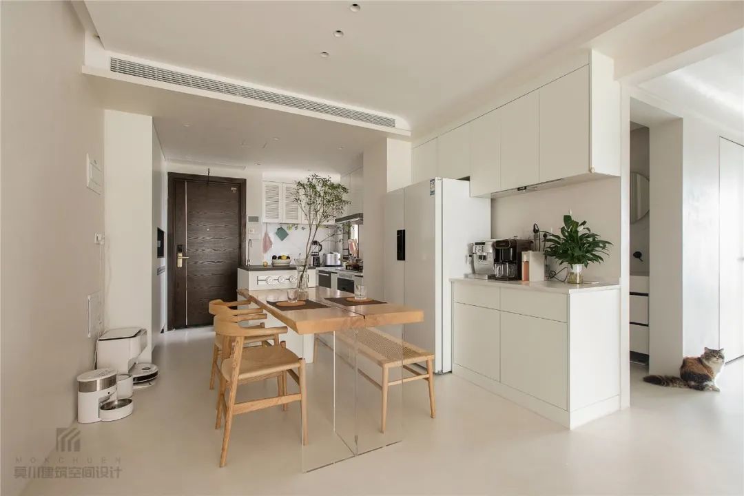 ▲餐桌椅后方靠墙定制餐边柜+冰箱嵌入摆放的设计,餐边柜上摆着小电器与绿植,营造出一种实用而清新的餐厅空间。