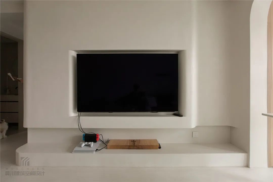 ▲电视墙以地台+嵌入电视机安装位的造型,在边角位置加入弧度线条设计,也让空间显得低调优雅而高级有趣。
