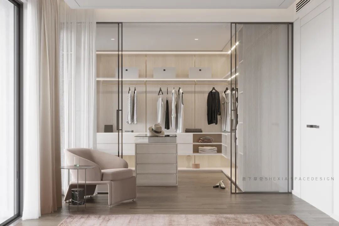 ▲卧室床尾后是一个独立衣帽间,以玻璃推门+纱帘的方式,让这个衣帽间空间通透灵活,衣帽间内的衣物开放挂出,也为主人提供了方便优雅的衣服收纳设计。
