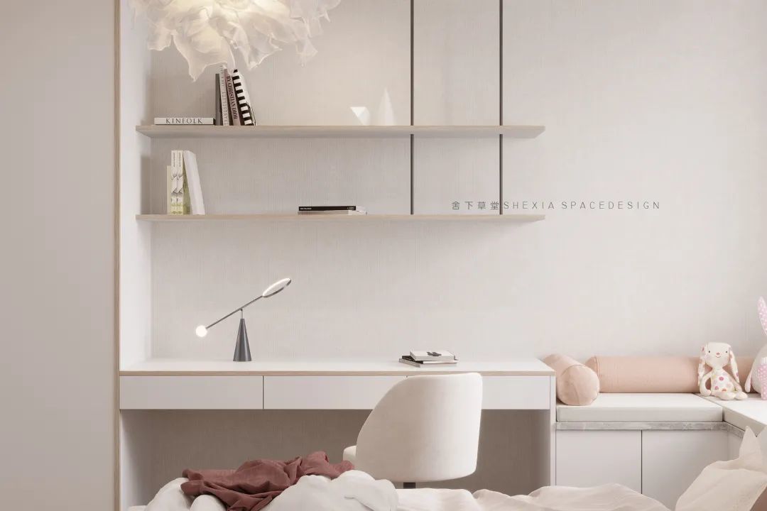 ▲定制衣柜+书桌+飘窗连贯一体,整个空间设计连贯性比较强,书桌上方再加入极简的书架设计,布置粉色的软装,也显得更加浪漫梦幻。