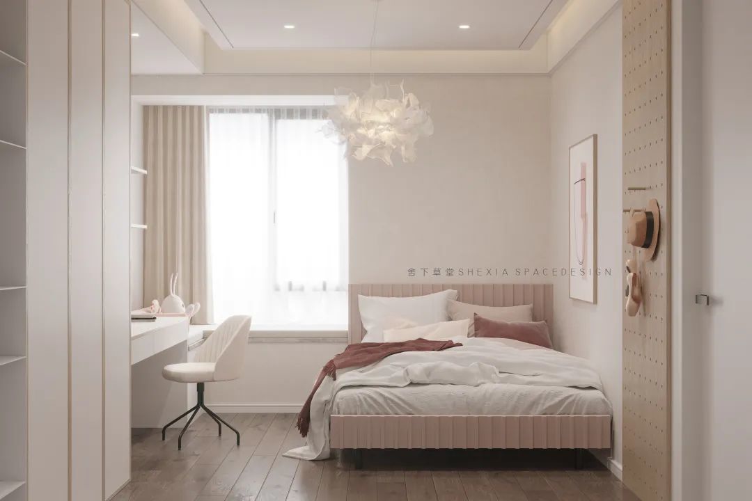 ▲儿童房整体简洁米白色的墙面空间,布置一张淡粉色的皮艺床,定制衣柜+书桌组合的设计,另一侧墙面还加入了洞洞板的收纳架,提供了一个灵活优雅的设计效果。