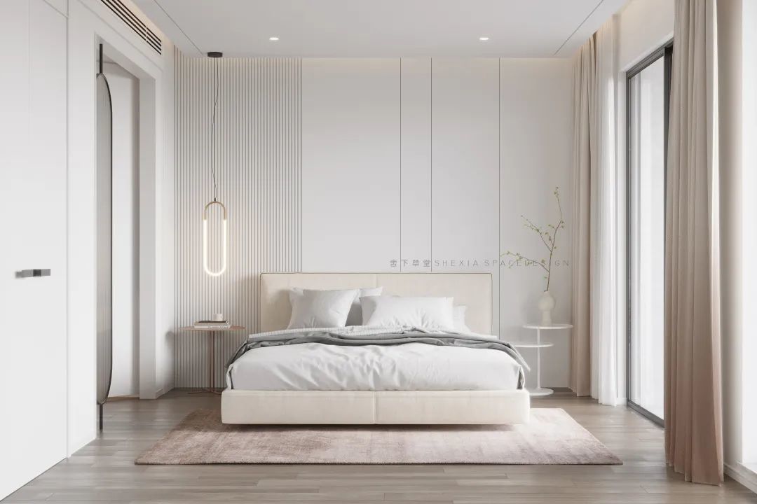 ▲卧室床头墙以灰白色的长城板+木饰面为背景,布置上米白色的皮艺床+灰色床单,地面铺设粉色调的地毯,床头左右加入极简的茶几与吊灯,也让这个卧室显得更加简约优雅而高级浪漫。