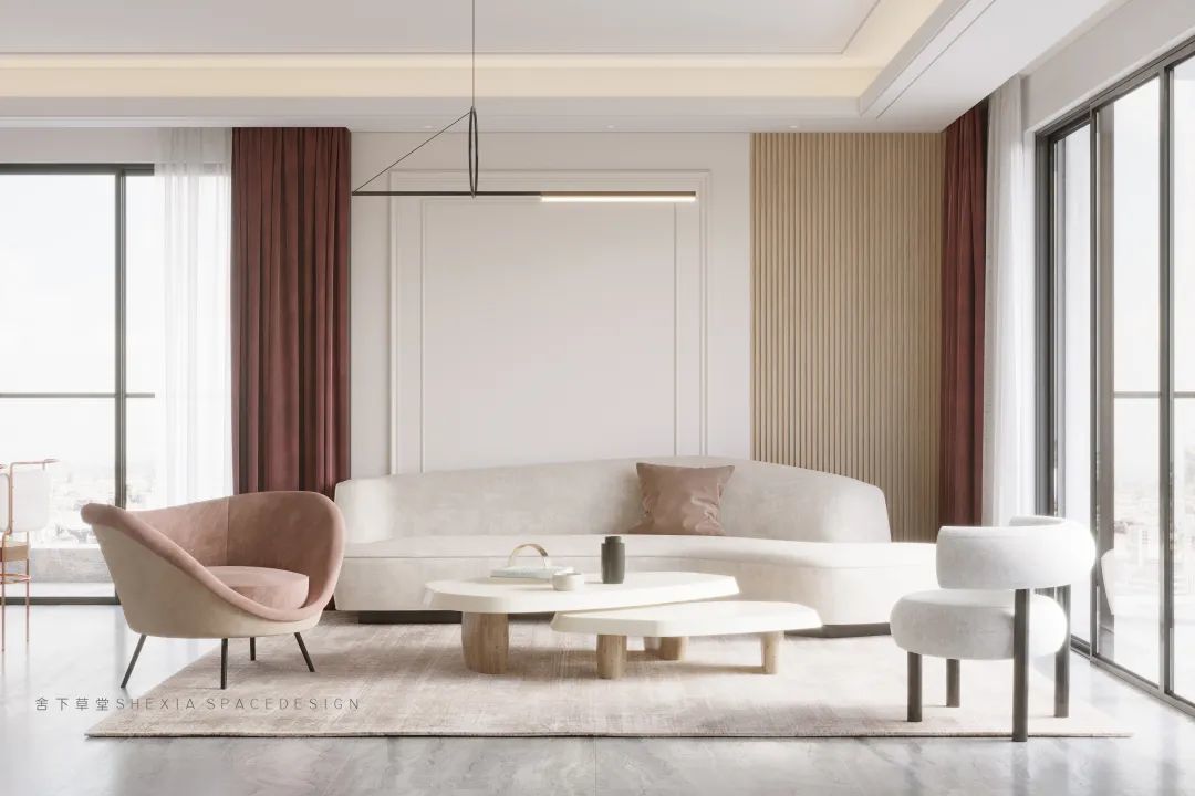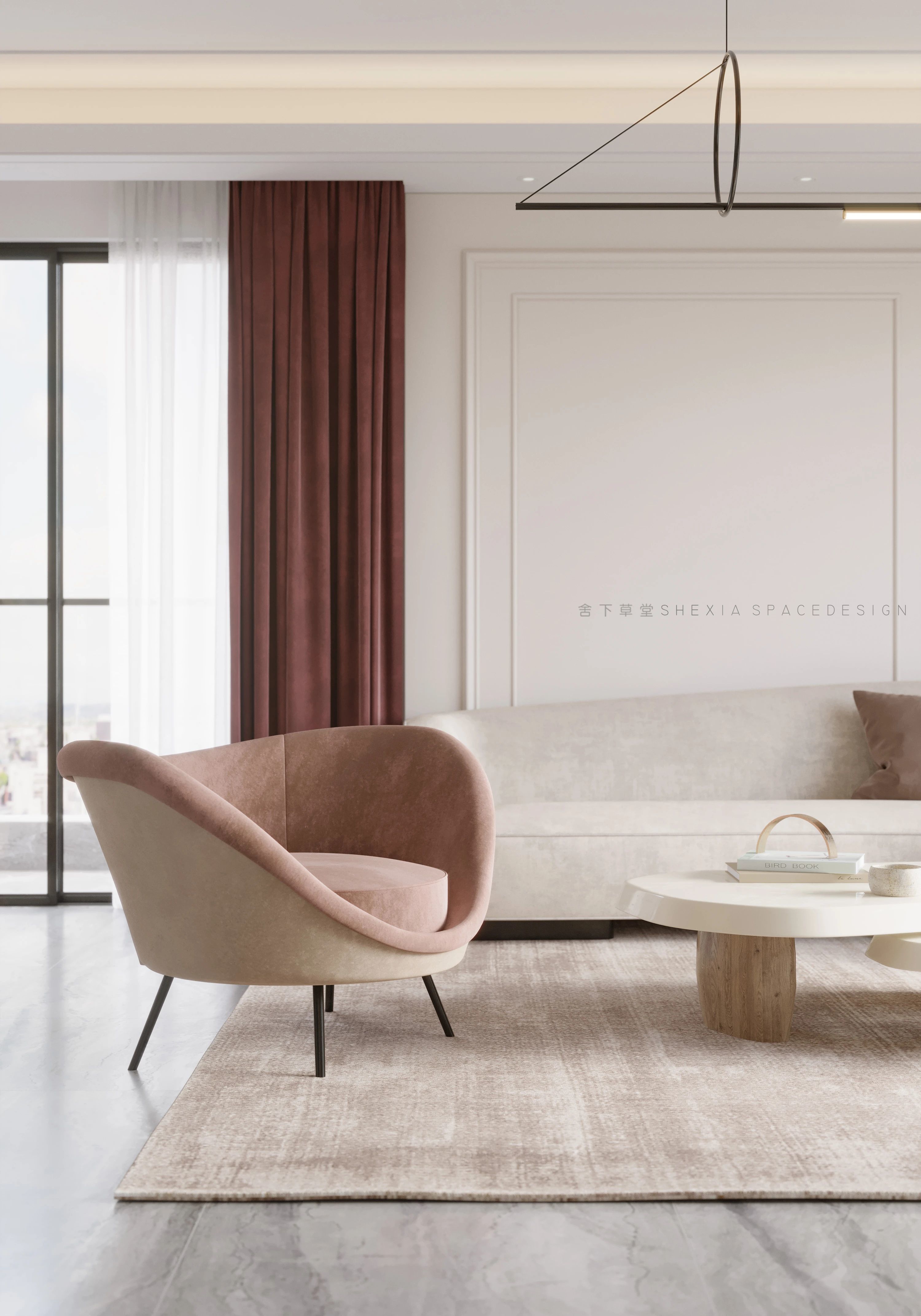 ▲客厅的设计风格比较独特,在极简范的氛围基调下,加入粉色调的软装布置,沙发墙上的护墙板+长城板组合,也带来了一种独特优雅而简约的高级氛围感。