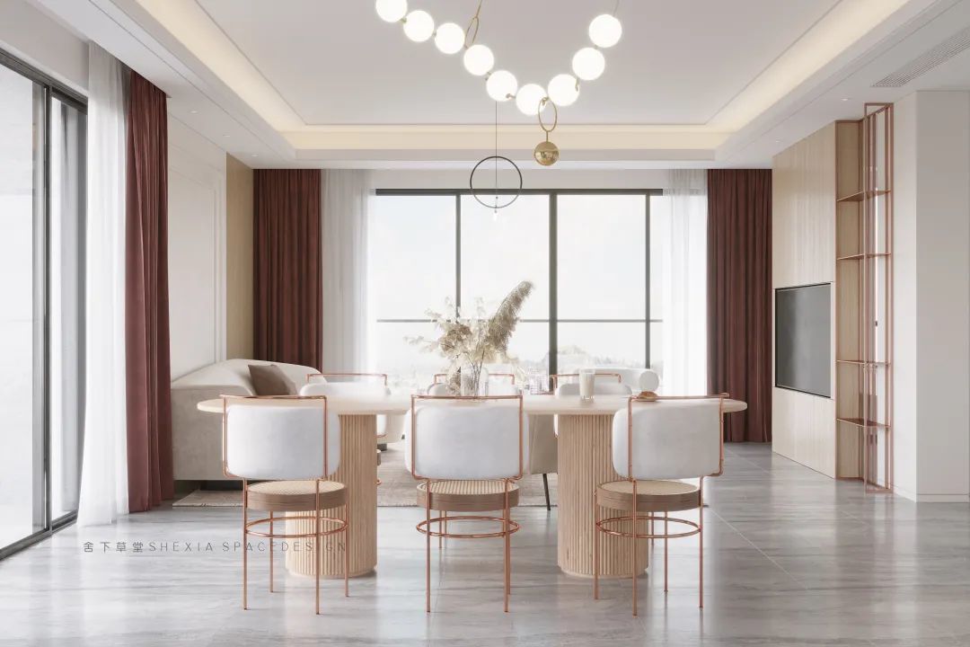 在这套200平米的大平层户型中,整体空间采取极简大方的硬装空间,布置上舒适现代的家具,并在细节加入轻奢范的金属质感与粉色调布艺软装,营造出一种简约优雅而浪漫高级的空间氛围感。