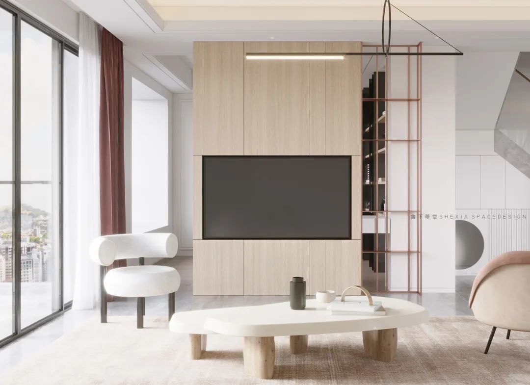 ▲电视墙面积较小、以木饰面为背景,左边是过道,右边加入金属展示架,布置上时尚造型的现代风沙发与小茶几,结合极简优雅的吊灯,搭配上粉色的窗帘布置,营造出一种简单奢华的高级气质。