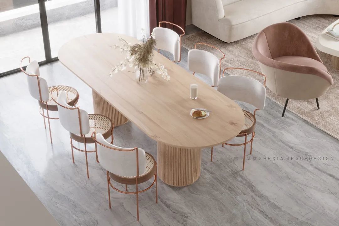 ▲造型优雅的实木餐桌,搭配上金属脚架的简约轻奢范餐椅,餐桌上布置花瓶、玻璃杯,也让空间显得更加优雅唯美。