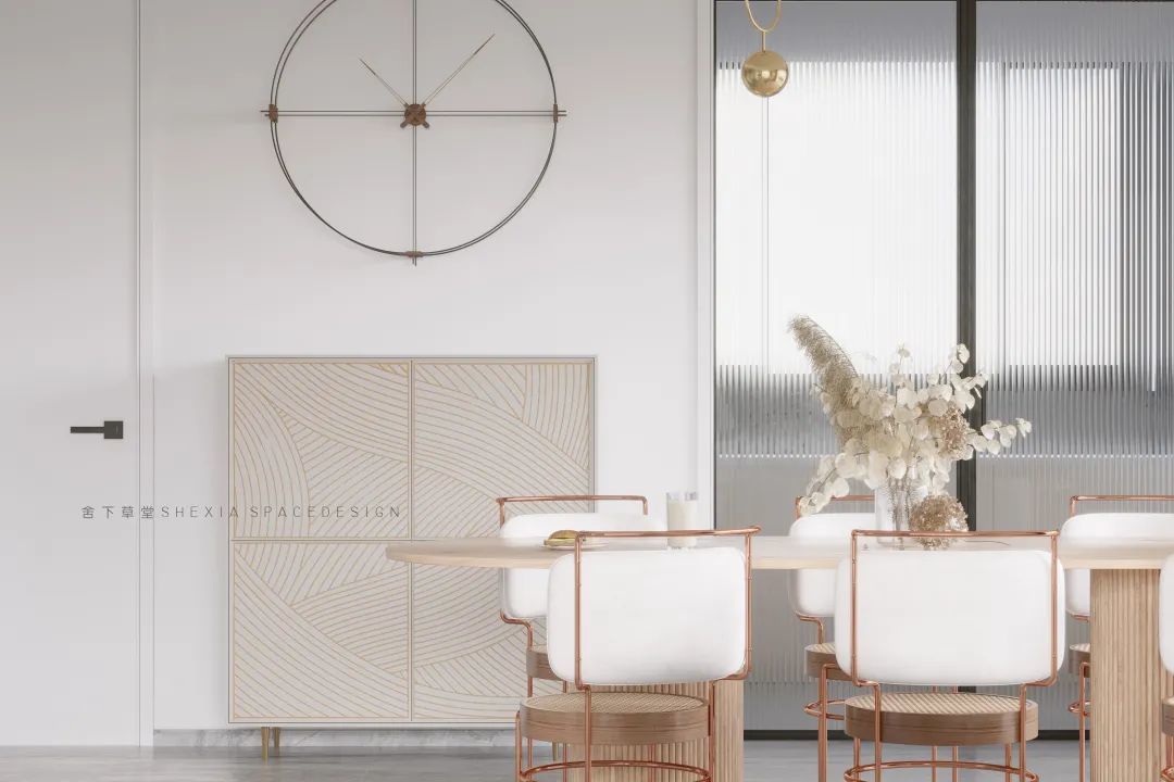 ▲侧边过道的护墙板墙面上,挂上一个极简的时钟,也为这个轻奢优雅的餐厅提供了一种高级优雅的空间氛围。