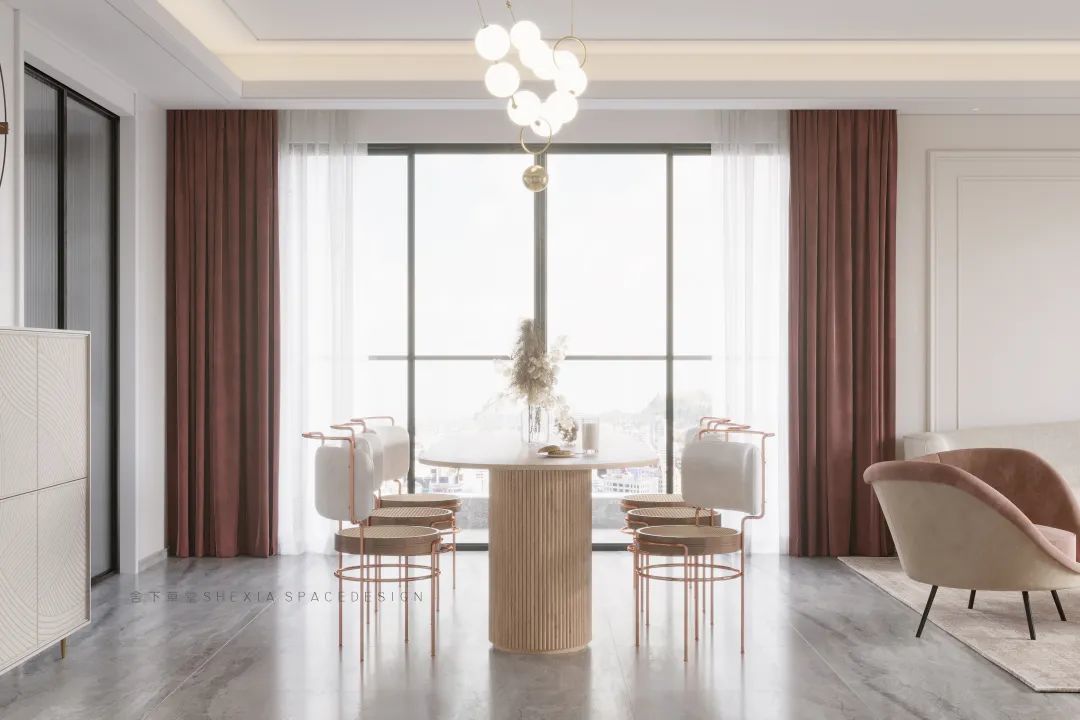 ▲餐厅布置上简雅轻奢的餐桌椅,上方一串球形的吊灯布置,使得空间营造出一种华丽精致的高级感。