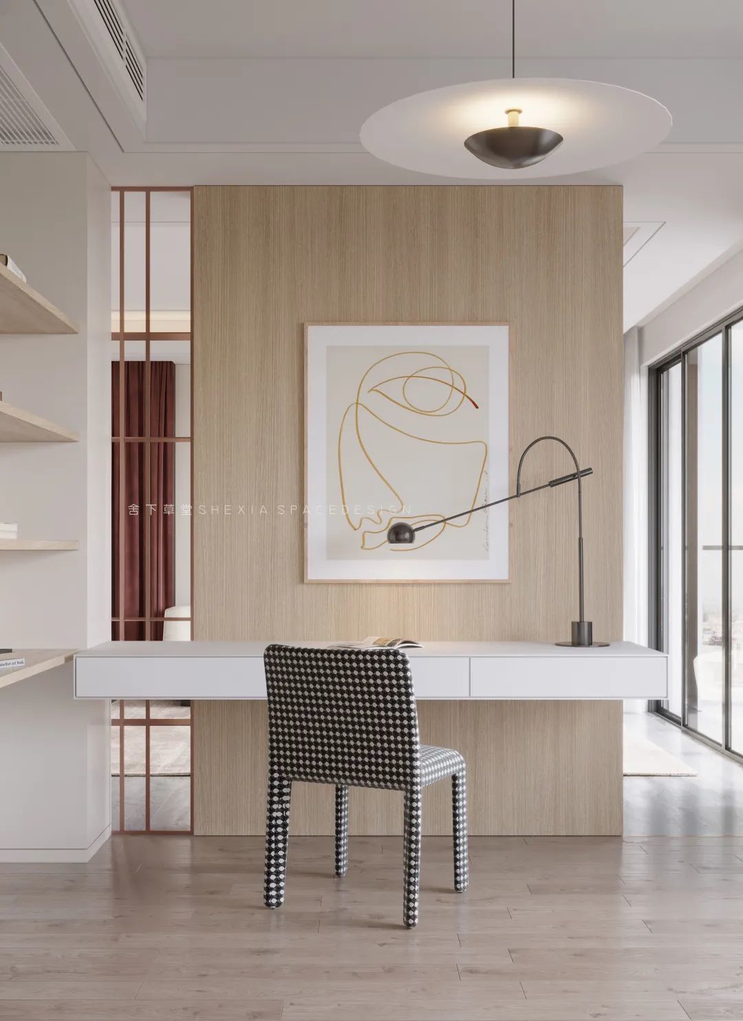 ▲电视墙后方的是书房空间,在电视墙后装一个悬空书桌,布置黑白格纹的布艺椅子,书桌前的木饰面墙面上挂一幅简约优雅的线条装饰画,书桌上摆一盏极简的台灯,整个空间与客厅互通的格局,显得格外的优雅大气。