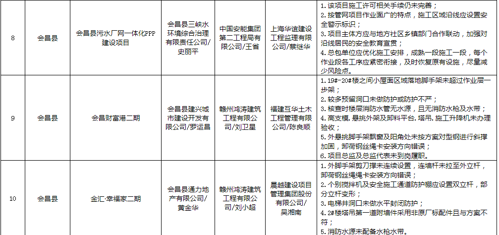 通报显示,存在问题的项目有:会昌县污水厂网一体化PPP建设项目,建设单位是会昌县三峡水环境综合治理有限责任公司,施工单位是中国安能集团第二工程局有限公司,监理单位是上海华谊建设工程监理有限公司;会昌财富港二期项目,建设单位是会昌县建兴城市建设开发有限公司,施工单位是赣州鸿涛建筑工程有限公司,监理单位是福建互华土木工程管理有限公司;会昌县金汇·幸福家二期项目,建设单位是会昌县通力地产有限公司,施工单位是赣州鸿涛建筑工程有限公司,监理单位是晨越建设项目管理集团股份有限公司。