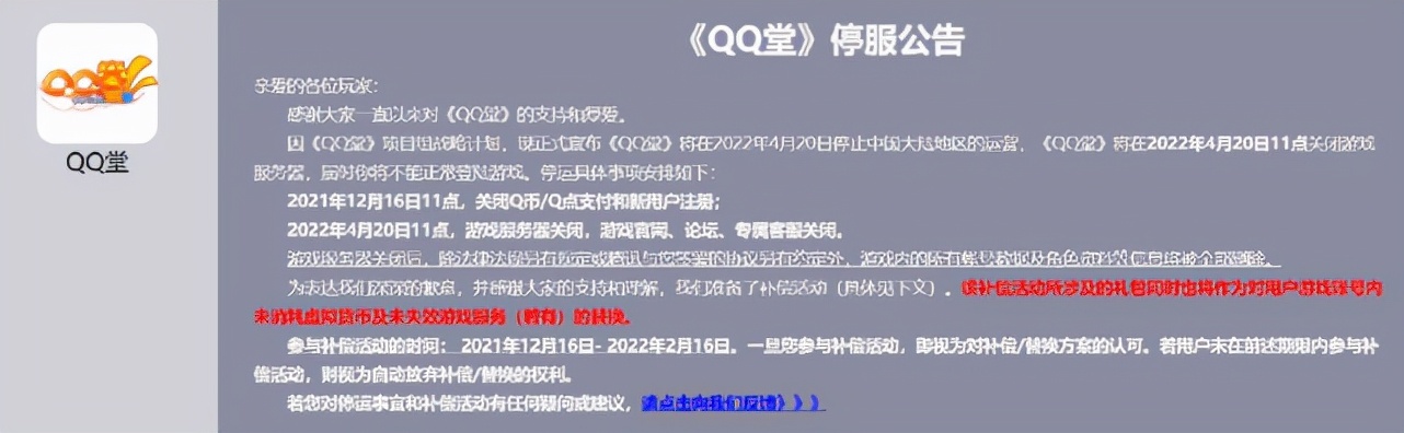 就这么款游戏,充满青春记忆的游戏,如今也要被关服了!就在今天,官方给了停服公告,具体时间安排:2021年12月16日11点,关闭Q币/Q点支付和新用户注册;2022年4月20日11点,游戏服务器关闭,游戏官网、论坛、专属客服关闭。