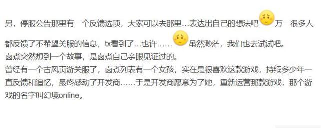 也有玩家看到公告后,给大家支招,说可以去官方反馈。而且还给出了一个动人的故事,说曾经有一个古风页游关服,一个女孩很喜欢这游戏,最终感动了开发商,于是开发商又开服了!这也算是个例外了!