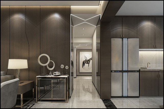 原户型的过道空间太小,与客厅不成正比,通过墙体的调整和墙面灯线造型的修饰,过道空间大了也不单调。整体空间动静分离,实用美观。