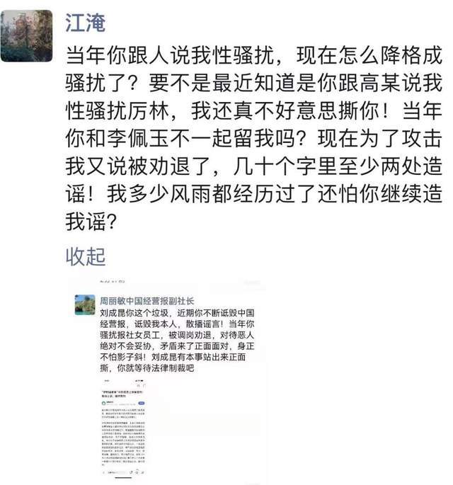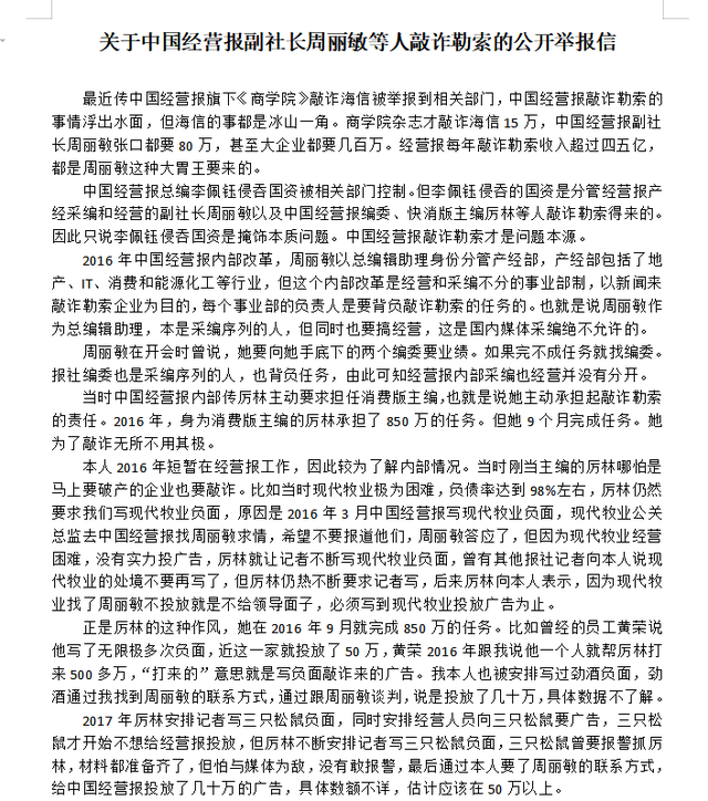 先有旗下《商学院》杂志敲诈被举报,再有中国经营报总编李佩钰侵吞国资被相关部门控制,自媒体大神刘成昆在媒体人交流群里,发布实名举报信,举报《中国经营报》副社长周丽敏、厉林下面一串“前同事”,制造负面勒索品牌而追求经济利益,现代牧业、三只松鼠、劲酒等一堆知名企业“被收保护费”。随后战火升级,周丽敏朋友圈开撕刘成昆,刘成昆立刻反撕造谣,硝烟弥漫在媒体人圈中。