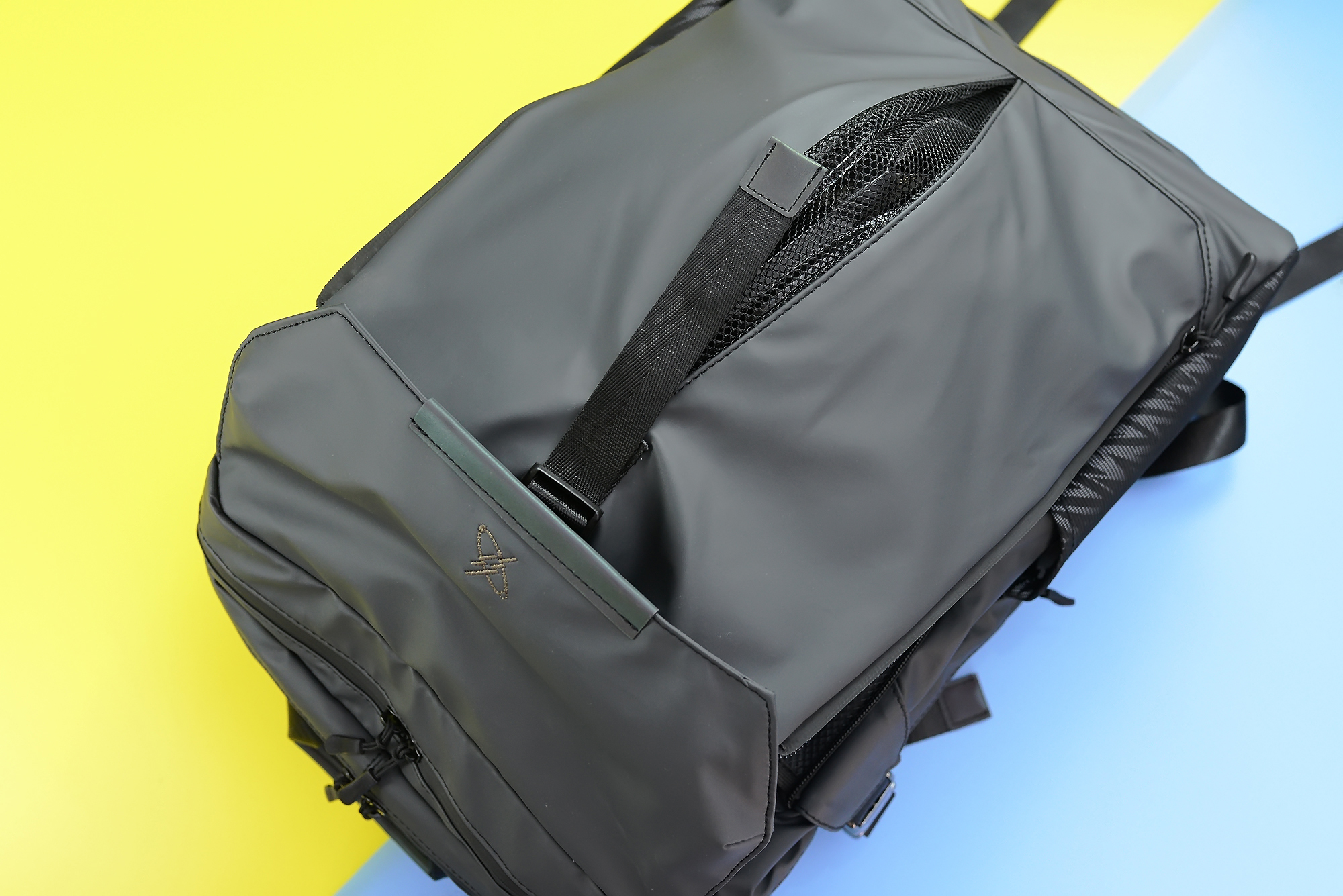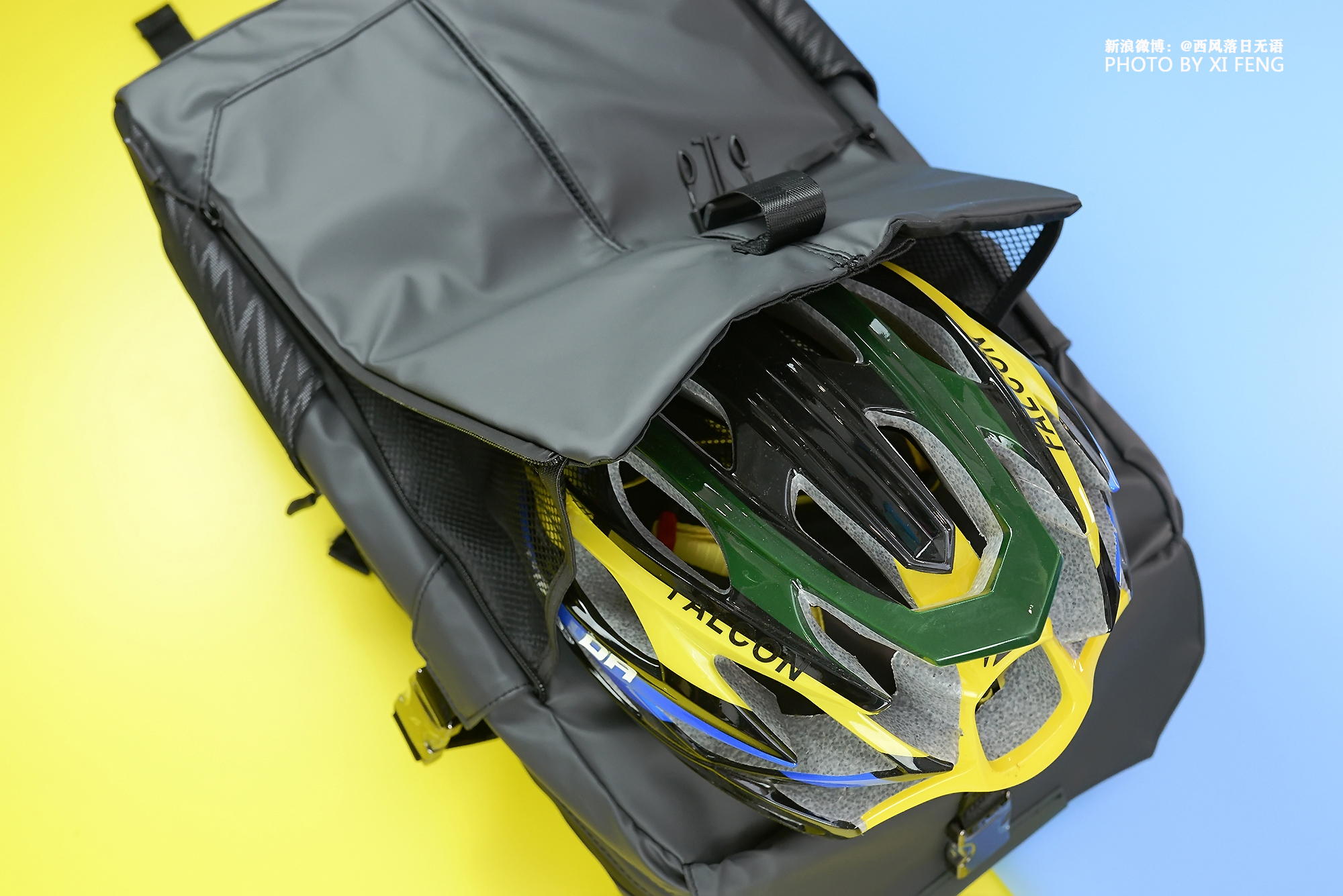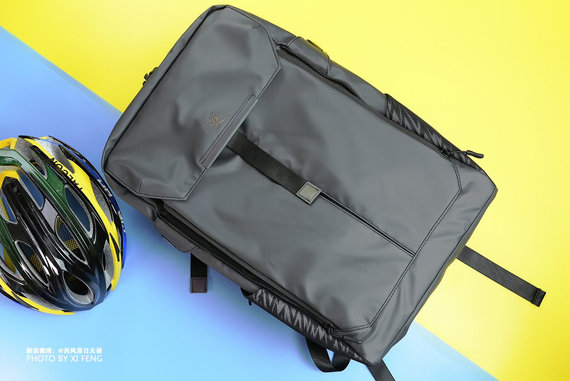 光影行星宙斯双肩机能背包的设计定位:商务、运动、旅行、多用。非常吸引我的设计在于,它外侧储物设计“膨胀起来”,居然装得下骑行头盔。对于有骑行爱好的我来说,确实喜欢的不行。