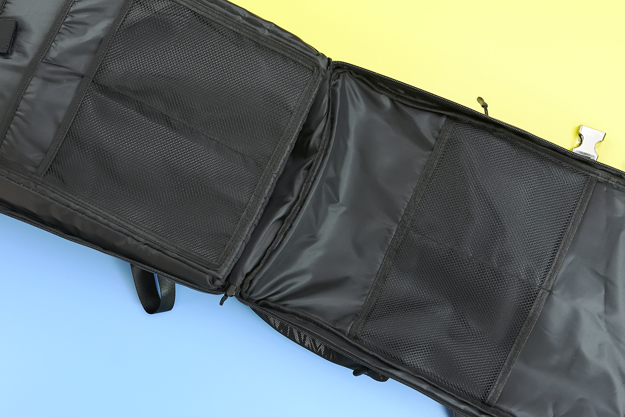 宙斯双肩背包后侧收纳空间,可以180度的打开,收纳物品可以更加便利。