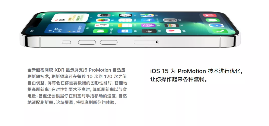 众所周知!苹果在 iPhone 13 Pro 和 13 Pro Max 机型加入 ProMotion 刷新率,也就是自适应刷新率,在你滑动内容时,屏幕会自动调节刷新率,最高可达 120Hz 刷新率,官网也提到。