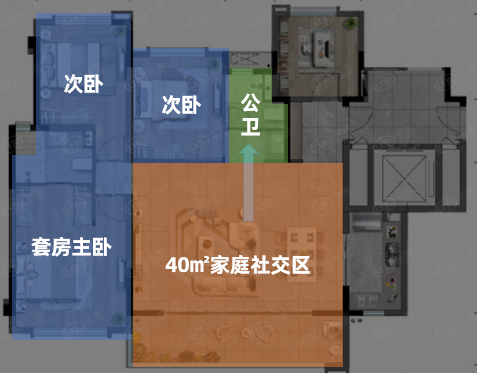 尤其是作为洋房产品,满足了改善置业对于家庭社交区的空间需求,超过40㎡大动区,公卫动线布局也较为便利,主卧及次卧构成独立的静区空间,私密性较好。